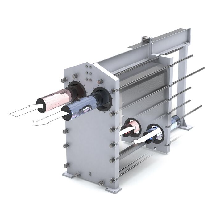 The connections of the media involved in the heat exchange are on the fixed plate, but can also be on the movable plate for multiple-pass flows. (see “Flow diagram”).